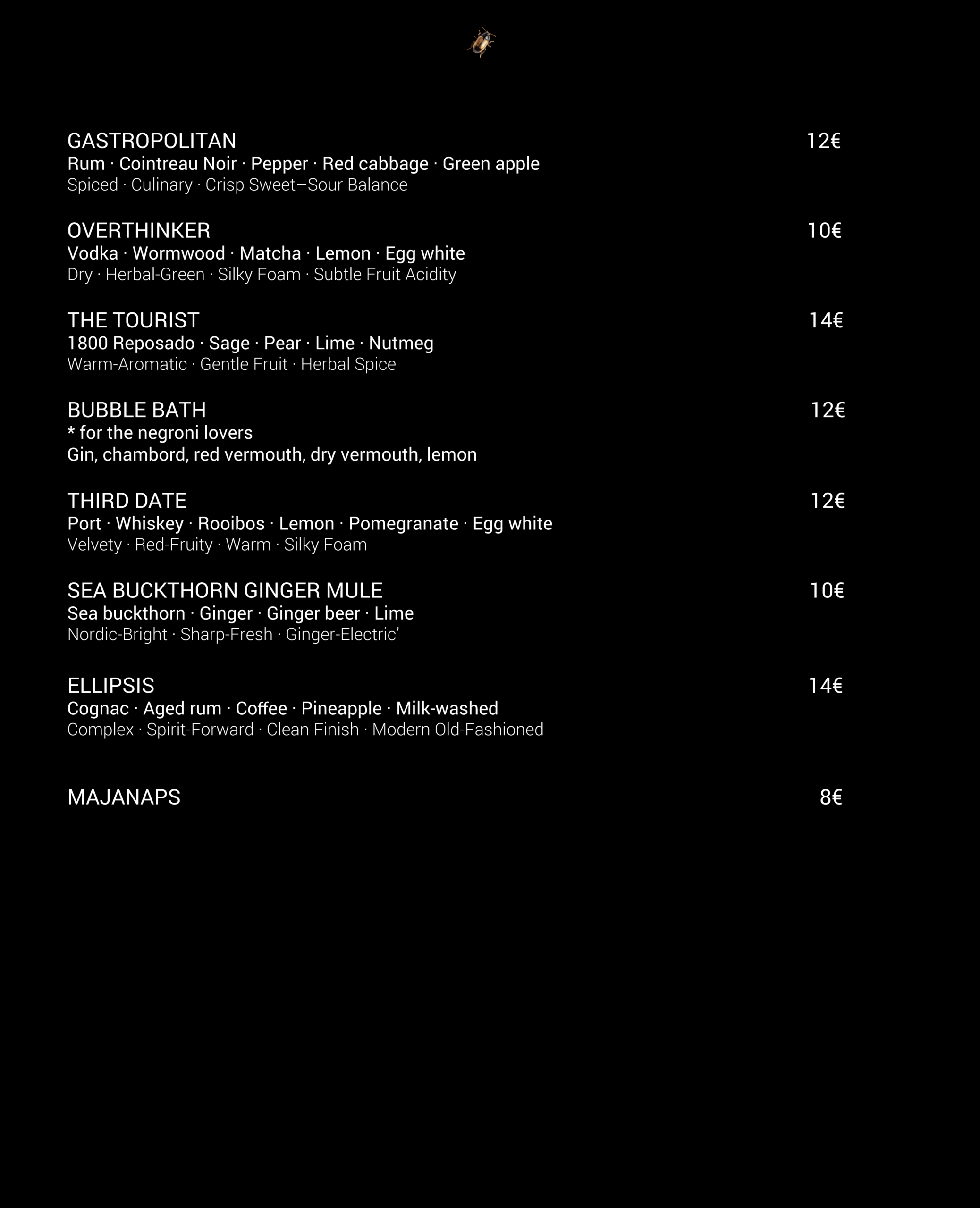 Iga jook on täpne, kihiline ja meeldejääv. A.JU signatuurjoogid ei täienda vaid rooga, vaid avavad uusi tajusid: aroomid, tekstuurid ja maitsed.