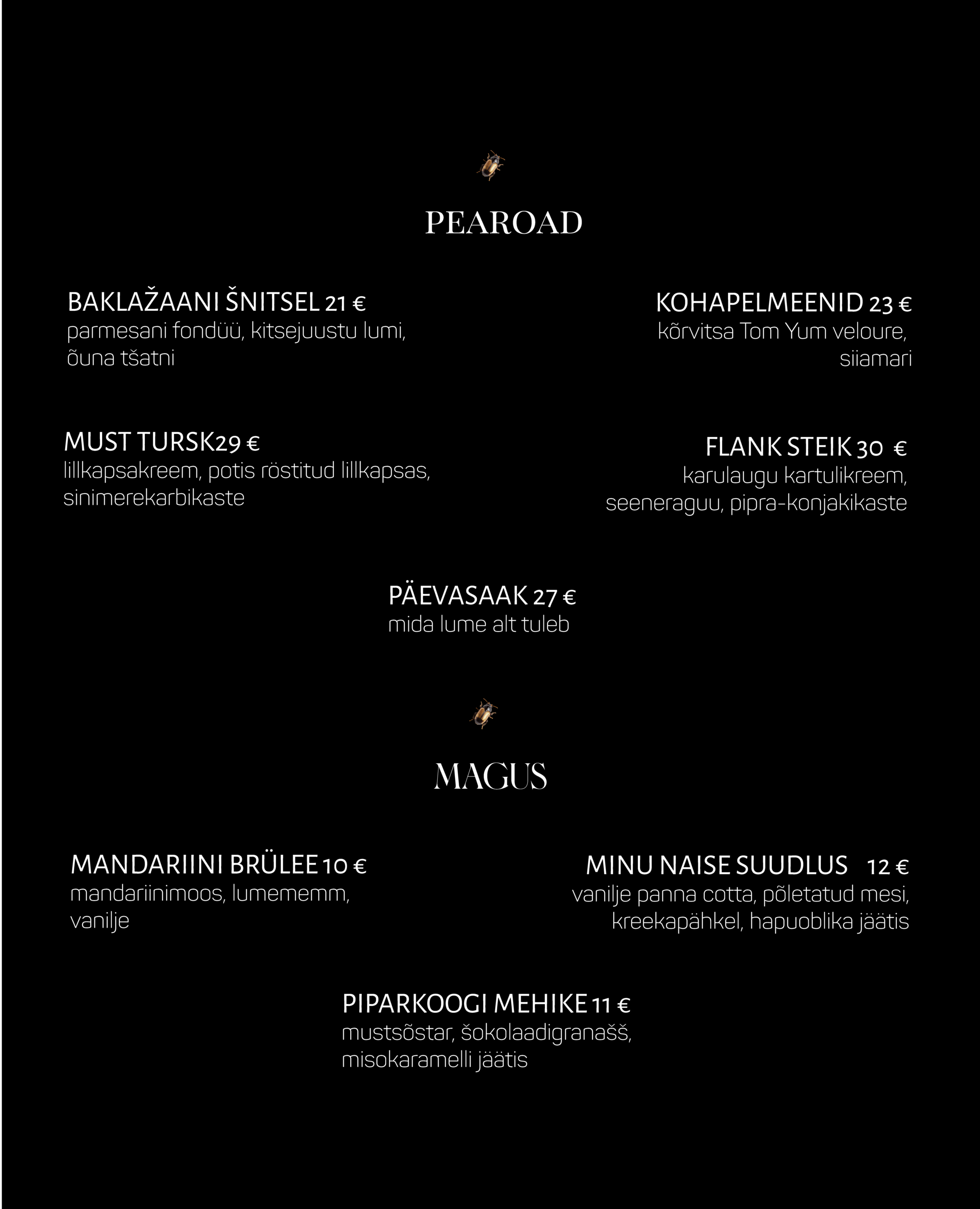 Meie mõttelennud taldrikul – roogadeks kehastunud ideed, mis kannavad A.JU olemust. Läbi tekstuuride, aroomide ja ootamatute maitsekombinatsioonide jutustavad nad lugusid, mis jäävad meelde kauemaks kui üks õhtu.